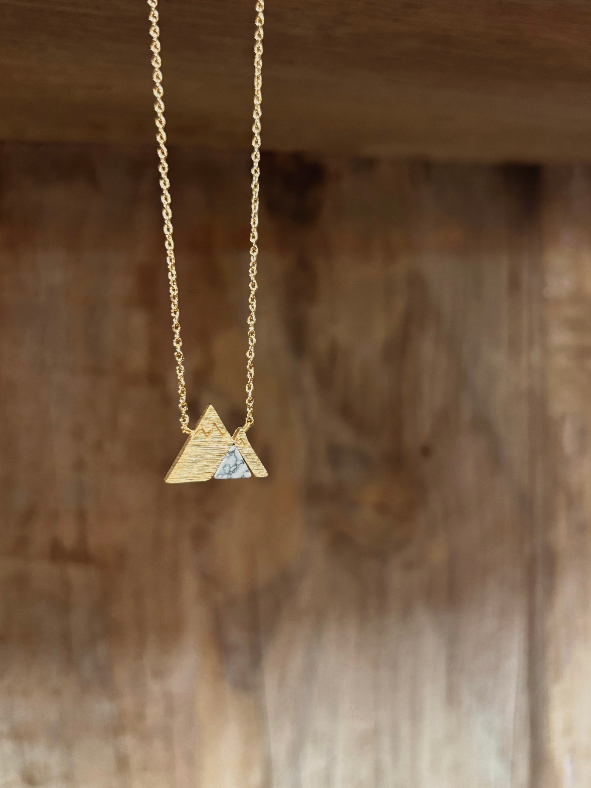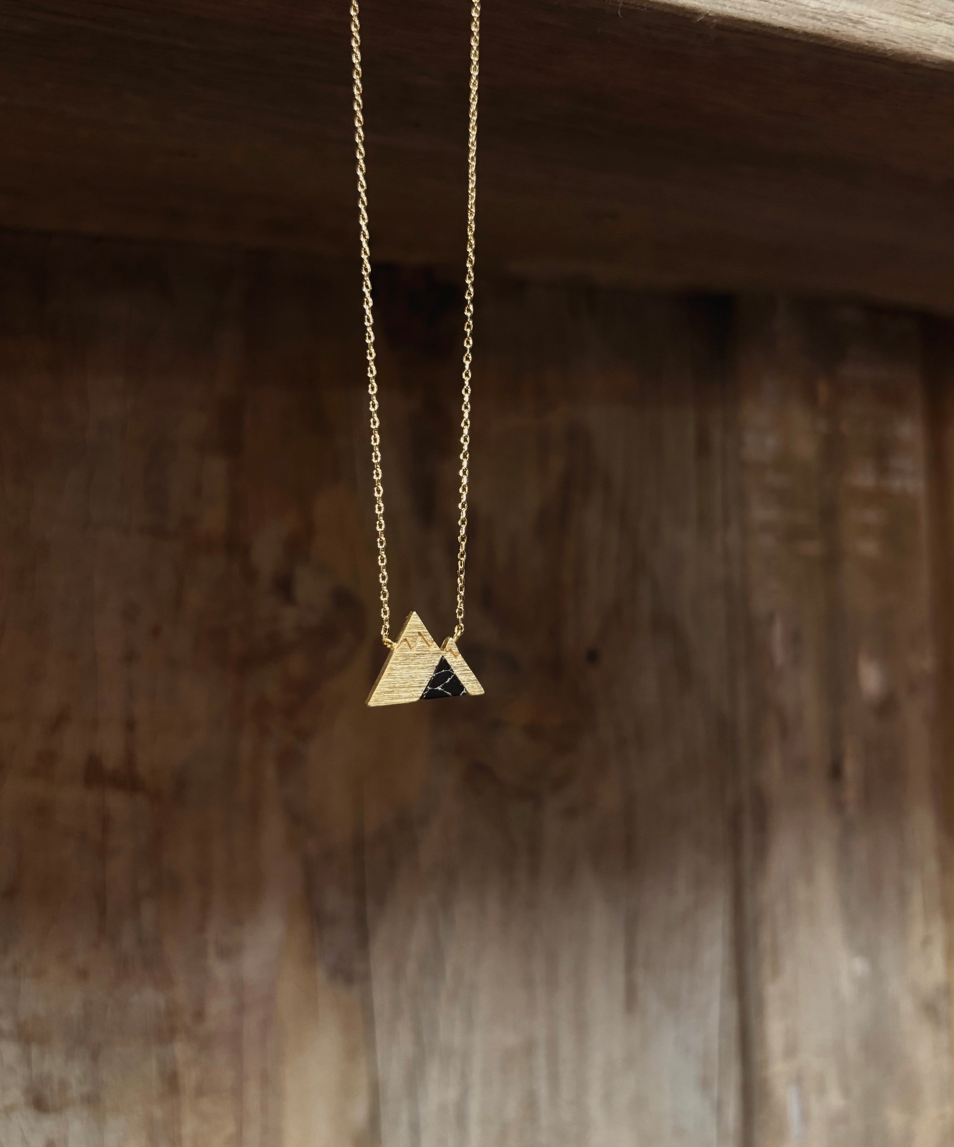 inspired by wide open skies and mountain silhouettes, the nez perce pendant necklace adds a touch of wanderlust to your everyday style. this 18k gold dipped pendant features a genuine gemstone inlay, bringing a subtle pop of color.