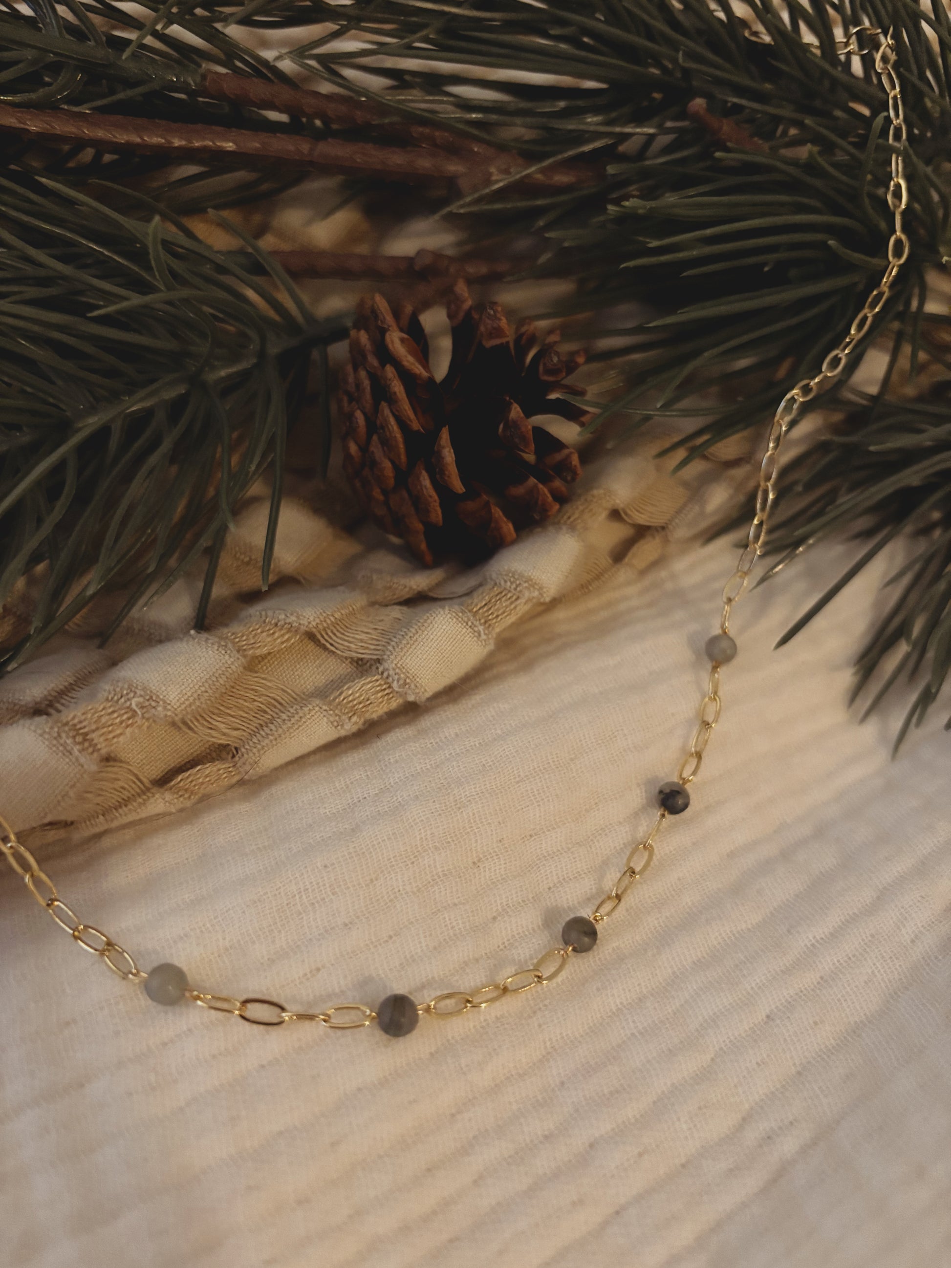 a delicate paperclip chain meets soft sage green labradorite beads, capturing the calm and beauty of mountain forests. inspired by the Bridger-Teton wilderness, this necklace is perfect for layering or wearing solo as a subtle statement.